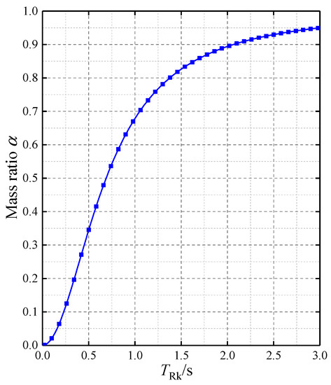 When the stiffness of the steel rack is determined (i.e., the elastic modulus ERk is constant), but the total mass of the rack is uncertain, the period TRk of the rack will vary through changing the mass of the rack. The constant elastic modulus ERk of the rack is determined following the principle that TRk = 3.0 s when the mass ratio α is 0.95. With the known ERk, TRk is 0.158 s when α = 0.05. Similarly, as TRk changes continuously (0.02, 0.04, ···, 2.98, 3.0 s), the corresponding relationship between α and TRk can be shown in Figure 11. It can be seen that the constant ERk obtained by this principle can make the mass ratio α reasonably distributed in the range of 0~0.95.