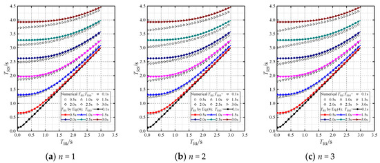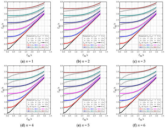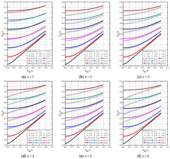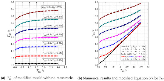 As the effects of TSS and TRk on TRS are mathematically the same, the relationship between the three periods can be accurately expressed by Equation (2), which is obtained according to the least squares method. The comparison between the numerical results and Equation (2) is also presented in Figure 7. The comparison shows that the maximum deviation is only 1.0%, so Equation (2) has excellent accuracy for both MA1 and MA2.