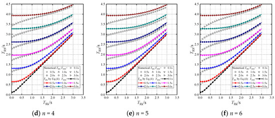 The analysis started with the case leading to the maximum difference in TRS between numerical results and Equation (4) in Figure 16, in which TSS0 = 3.0 s, n = 6, and α = 0.6. In this case, the period TSS is 3.93 s. The TRS obtained from Equation (4) () is larger than the numerical result, especially when TRk < 1.0 s.