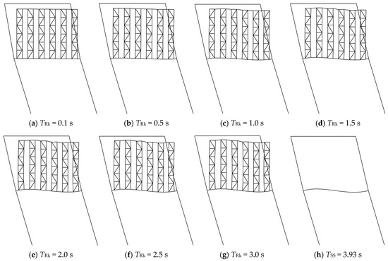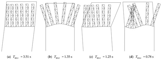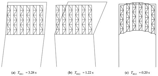 For the new modified model with no-mass racks in Figure 21, the influence of the different racks is included by setting different values of ERk corresponding to TRk = 0.1, 0.5, 1.0, 1.5, 2.0, 2.5, and 3.0 s. Modal analysis on modified models with these different racks is conducted. The obtained are listed in Table 3, and corresponding modal shapes are plotted in Figure 22a–f. For comparison, the modal shape of the simplified structure without racks (TSS = 3.93 s) is also given in Figure 22g.