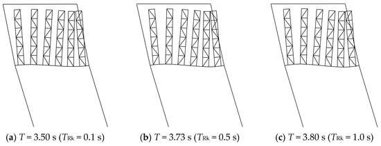 When TRk = 3.0 s, the racks have a small effect on the stiffness of the frame beam. The vibration amplitude of the frame beam is 92.3% of that in the simplified structure shown in Figure 22h with the corresponding = 3.88 and s = 0.99TSS. Thus, the vibration characteristics of the two models are almost identical. In this case, the value of TRS obtained from numerical results is basically equal to that obtained from Equation (4), as shown in Figure 16f.