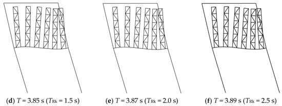 It is found in Table 4 that, when TRk > 1.0 s, the of the modified model with no-mass racks is not significantly affected by the top connecting bars. The modal shapes corresponding to different are quite similar, as shown in Figure 23. However, when TRk < 1.0 s, the strengthening effect of the connecting bars on the frame beams cannot be ignored.
