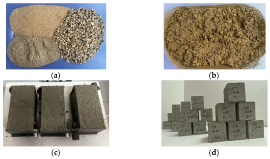 Concrete components (a), fiber concrete mixture (b), samples in molds (c) and finished samples (d).