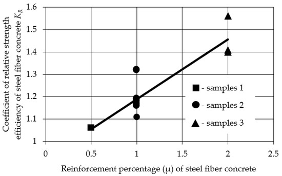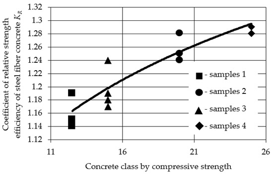 - For 1–5 series of tests: the coefficient of the relative strength efficiency of fiber concrete is defined as Kr = rf/rb (where rf—strength of fiber concrete sample, MPa; rb—strength of concrete sample (without fibers), MPa);