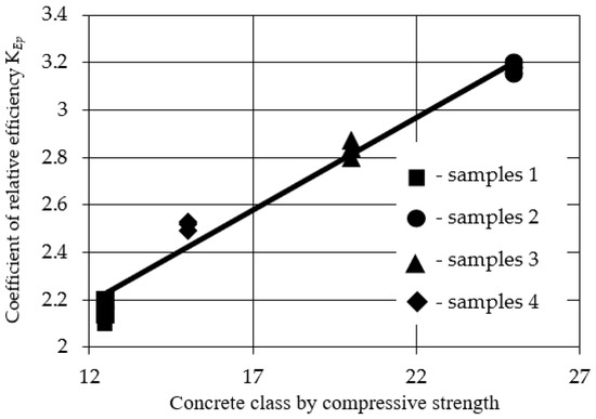 The dependences of KEn and KEp on concrete class of steel fiber concrete are described by rectilinear functions (Figure 9 and Figure 10), which provide the following formulas for predicting the energy costs of hammer Esfn and Esfp with regard to the concrete class of compressive strength
