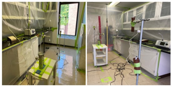 Using additional plastic sheeting, we created an ante-chamber inside the laboratory by the door to the hallway. The ante-chamber was used as a doffing area for personal protective equipment (PPE) worn inside the experimental area and as a staging area for the air sampling. Accounting for the benches, cabinets, large equipment, and volume separated by sheeting, the mixing volume of the room was estimated to be . Before the experiments, all the surfaces in the room were wiped down using a mop (floor) and sponge (benchtop) with lab-prepared ethanol solution. Following the experiments, all the surfaces inside the room were thoroughly cleaned with disinfectant (Quatricide PV-15, Pharmacal, Waterbury, CT, USA).