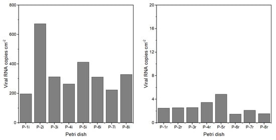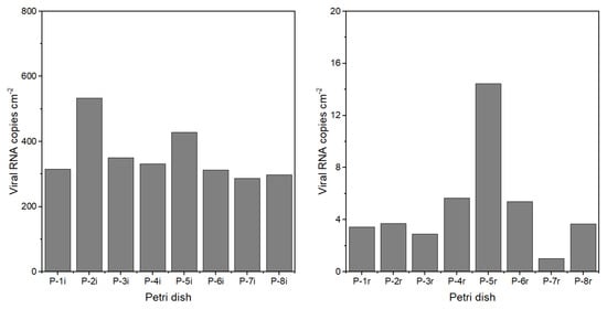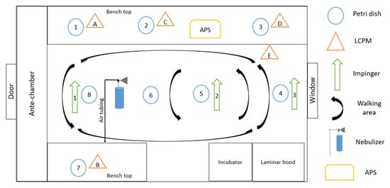 h, an investigator entered, carefully conducted sampling activities for approximately 10 min to collect the pre-resuspension samples and initiate the resuspension samples, and then walked continuously in the room for 20 min to resuspend the particles. We collected the viral particles in impingers and on deposition plates at multiple locations inside the room (