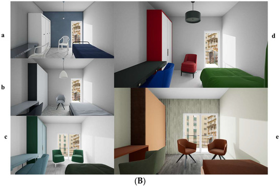 Architects from the Department of Architecture and Industrial Design of the University of Campania L. Vanvitelli (Italy) designed five bedrooms. In order to avoid methodological confounds, we kept some features under control: the size of the room; the type and number of elements/objects; the spatial layout of elements; the viewing perspective. Specifically, each room had a surface area of 9 m2, was furnished with a bed, a table a chair, an armchair, and a wardrobe, and had a window with an outdoor view (i.e., buildings facades). Moreover, all the rooms had the same arrangement: the bed on the right side of the room; the table with the chair and the wardrobe on the left side of the room; and the armchair in front of the window (see Figure 1A, depicting a map of the rooms). Finally, all rooms were viewed according to the same perspective (i.e., the window with the armchairs in front of the subject). Keeping these features stable, the rooms differed in colors, materials, textures, and furniture style (for previous studies using a similar approach, see [23,25]). We categorized the rooms as follows (see Figure 1B):