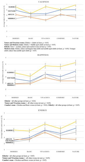 As for the effect of age, in general, elderly participants reported feeling happier, calmer, and more energized than other participants. Figure 2 clearly shows that elderly participants rated the nature room more positively than other groups, and younger adults rated this room more positively than adults aged from 30 to 65 years. The comfort room was evaluated as eliciting higher happiness by elderly participants than all others. Elderly participants rated the vivacious room more positively than the other groups. Furthermore, elderly participants evaluated the basic room as less calming than others, except the vivacious one, and evaluated the nature, modern and vivacious rooms as more calming than adults aged 30–65 years indicated. When exposed to the modern room, the elderly reported higher calmness and happiness (except for younger adults) and more energy than other groups, while younger adults reported higher happiness than energy and higher calmness than middle-aged adults.