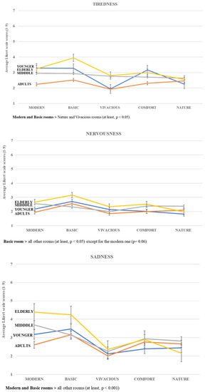This figure represents a summary of the results of the comparison between types of rooms (modern, basic vivacious, comfort, and nature) and between negative (tired, nervous, sad) evaluations within each room. Average Likert-scale scores (range 1–9) for each emotion as a function of age group (younger, adults, middle-aged, elderly) are shown. Statistically significant differences for each ANOVA are reported above each graph. The symbol ‘>’ stands for ‘positive/negative ratings greater than’. Error bars represent standard error.