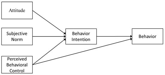 The Theory of Planned Behavior (TPB) was developed via the Theory of Reasoned Action (TRA) proposed by Fishbein et al. in 1975. As a widely known theoretical model, the Theory of Reasoned Action is better at explaining and predicting individual behavior [], but has a major limitation [], i.e., it does not take into account the influence of external factors on individual behavior. To compensate for the shortcomings of TRA, Ajzen [] continued to add perceived behavioral control (PBC) variables to its foundation to reflect individuals’ ability to control behavioral outcomes, making the theory of planned behavior mature. The five behavioral variables of the theory of planned behavior include attitudes, subjective norms, perceived behavioral control, behavioral intention, and behavior. The theory considers behavioral intention as a direct influence on individual behavior, while subjective norms, behavioral attitudes, and perceived behavioral control are common factors that influence individuals’ behavioral intention. The advantage of this theory is that it constructs a systematic analysis framework, clearly demonstrates the decision-making process of individuals or organizations on expected behaviors, and fully considers the influence of multiple factors on individual behaviors, including the psychological cognition of the actor, internal and external environmental influences, and reduces metric bias. After extensive practice and behavioral research, the Theory of Planned Behavior has demonstrated more effective explanatory and predictive power than the Theory of Rational Behavior for individuals’ decision-making behavior. The theoretical model of the Theory of Planned Behavior is shown in Figure 1.