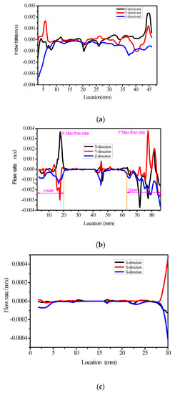 The SGC specimen’s flow velocity distribution is mostly at the two ends of the specimen, such as the horizontal direction of the bottom section of the specimen (0–20 mm). The flow velocity varies substantially in all three directions, with the X direction reaching its highest at 17 mm. The flow velocity in the horizontal and vertical directions changes significantly towards the top end of the specimen (63–86 mm), owing to the high effective void ratio and substantial void connectivity. However, the rate of flow in three directions is quite low within the center of the specimen, and the fluctuation is not significant even when the flow velocity is zero, showing that there is no water retention in this location.
