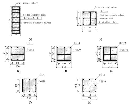 Specimen size details. (a) Sectional diagram. (b) Cross-sectional diagram. (c) Rebar reinforcement diagram of ECCT−02. (d) Rebar reinforcement diagram of ECCT−01 and RCT−01. (e) Rebar reinforcement diagram of ECCT−03. (f) Rebar reinforcement diagram of ECCT−04. (g) Rebar reinforcement diagram of ECCT−05.