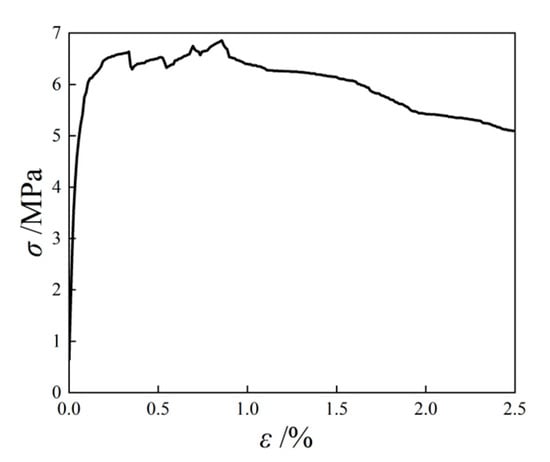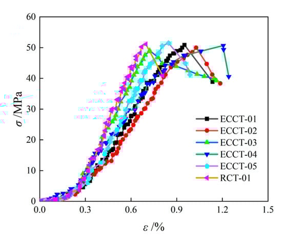 At the initial loading stage, the axial load increased linearly with increasing strain in the form of a straight line. When approaching 60–80% of the peak load, the stiffness of the material decreased, and the rise in stress was also reduced and showed a curved pattern. When the load fell to about 60–70% of the peak load, the decreasing speed of the falling section slowed down, and the specimen gradually lost its load−bearing capacity until it was destroyed.