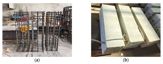 The HPFRCC/RC-prefabricated shell composite column was casted side by side. The rebar-welded meshes were made first. The stirrups and longitudinal bars were connected by welding. Then, the mold shell was prefabricated, and finally, the core concrete was poured. The actual specimen is shown in Figure 4.