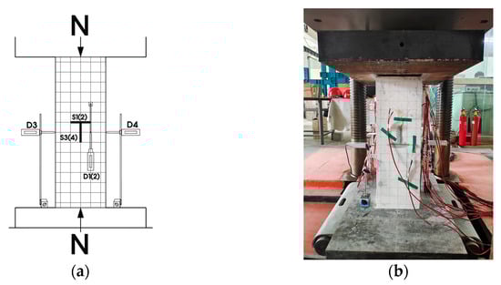 The strains of rebar and concrete were measured through resistance strain gauges, and the strain gauges were arranged as shown in Figure 6. Two displacement sensors (D1, D2) were symmetrically arranged to monitor the axial deformation of the specimen. Two horizontal displacement sensors (D3, D4) were symmetrically arranged to measure the transverse deformation of the column. Two transverse strain gauges (S1, S2) and two longitudinal strain gauges (S3, S4) were symmetrically arranged on the concrete to monitor the stain of the concrete. The data were recorded by the DHDAS dynamic signal acquisition and analysis system. The instrument layout is shown in Figure 5 and Figure 7.