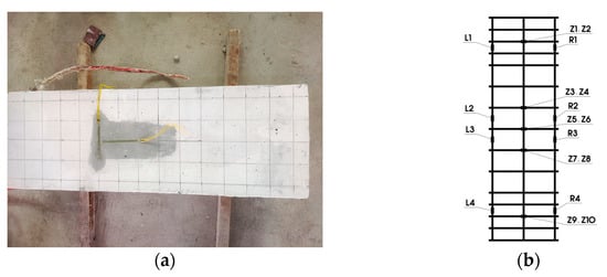Strain gauge pasting layout. (a) Concrete strain gauge location. (b) Rebar strain gauge location.