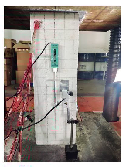 The axial compression test was conducted through the 5000 kN electro−hydraulic servo pressure tester. The test setup and instruments are shown in Figure 5. The specimen was placed in the correct position, and a level for vertical calibration was used to prevent local compression damage. Before the formal test, the composite column specimen was preloaded to eliminate the contact gap between the composite columns and the pressure plate of the testing machine. The loading process was displacement-controlled for safety. The tests were loaded at a constant speed. The loading speed was 0.2 mm/min, every displacement of each level was 0.3 mm, and the load was then sustained for 120 s. The purpose of sustaining the load was to give the structure time to deform fully under load, as well as time for observation and analysis of the experiments conducted during that time. The data acquisition frequency of the WDW electronic universal testing machine control system was 10 Hz. Grids (50 mm × 50 mm) were drawn on the surface of the composite column before the test to observe the development of the crack more intuitively. When the cracks appeared or extended, they would be drawn with a pencil to record their development. When the crack width increased, the crack width measuring instrument was used to monitor the crack width. The test was stopped when the load dropped to 60% of the peak load.