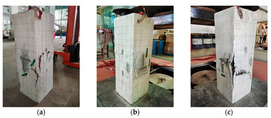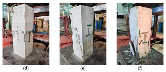 - For the ECCT−01 specimen, when the load reached 1000 kN, several minor vertical cracks appeared at the top of the column and the length was 40 mm. As the load increased, the crack continued to develop. When the load reached 2470 kN, the crack penetrated vertically. When the load reached 2640 kN, the transverse crack in the middle of the specimen was connected. When the load reached the peak load, the concrete in the middle of the specimen cracked outward transversely. Then, the load showed a downward trend. When the load decreased to 2095 kN, the vertical cracks at the top and bottom of the column expanded with a width of about 3 mm, and the HPFRCC shell cracked at the corners of the lower and middle parts of the column.