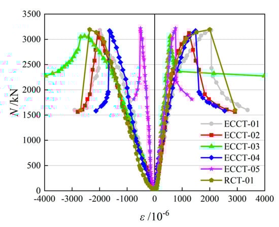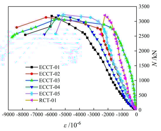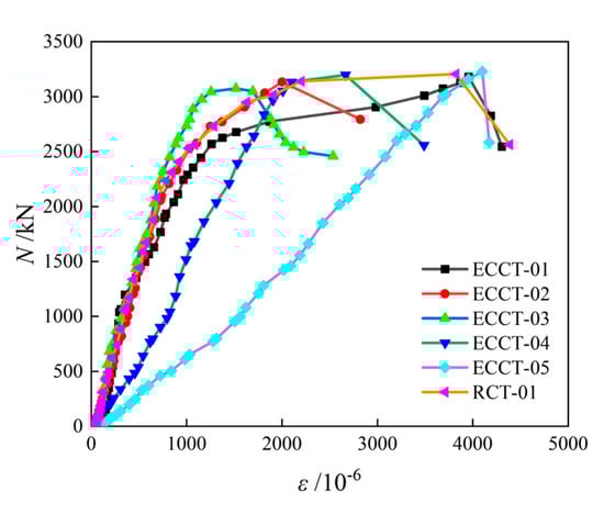 The influence of different volume stirrup ratios of ECCT−01, ECCT−02, and ECCT−03 on the axial load−longitudinal reinforcement strain curve is shown in Figure 11. Comparing ECCT−01, ECCT−02, and ECCT−03, three specimens all maintained a linear growth in the initial strain, and the overall curve development law was basically similar. The longitudinal reinforcement strains of ECCT−02 and ECCT−03 increased slowly in the early stage of loading. When the axial load reached 80% of the peak load, the strain increase rate of the stirrup was greatly increased. It can be seen that with the increase in the volume stirrup ratio, the peak load of each specimen gradually increased, and the restraint effect on the longitudinal reinforcement was greater, making the specimen yield later. And the deformation ability of the specimen was enhanced.