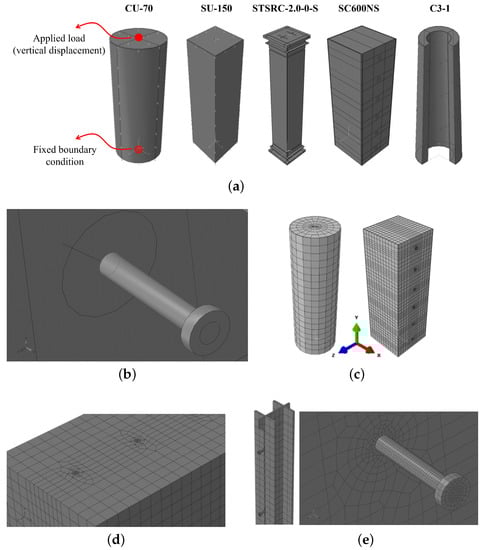 The use of a fully integrated element such as C3D8R in Abaqus allows for accurate stress and strain predictions throughout the model. The average mesh size used in this study (35 mm) was chosen in order to balance computational efficiency and accuracy. The meshing arrangement was designed to capture the geometric features of the specimens while minimizing the number of elements required (Figure 2c). The partitioning command in Abaqus was used to ensure proper contact between the steel section, studs, and concrete, allowing for accurate transfer of both loads and boundary conditions. The detailed meshes of the studs and the steel case in specimens STSRC-2.0-0-S and SC600NS (Figure 2d,e) ensured accurate prediction of stress and strain concentration in these regions.