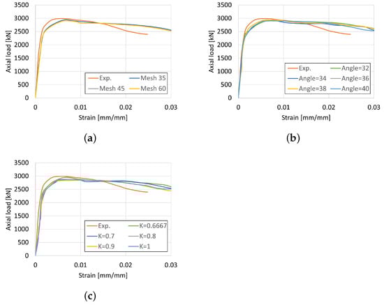 In addition to the sensitivity analysis conducted earlier, a further investigation was carried out to explore the impact of different values of the Kc parameter in the CDP model. Figure 4c illustrates the influence of varying the value on the behavior of the tested specimen. Five different values of the Kc parameter were tested: 0.667, 0.7, 0.8, 0.9, and 1. The results indicate that varying the parameter does not significantly affect the load–strain response of the specimen. As the parameter decreases, both the load and the ultimate displacement values tend to increase minimally. Based on these findings, it was determined that for all future analyses the default value of 0.667 for the parameter would be selected.