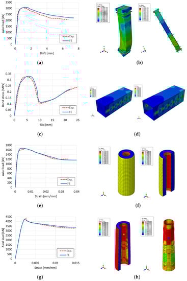 Generalized capacity curves for four new specimen after model calibration, including the stress distribution in MPa: (a) capacity curve, STSRC-2.0-0-S; (b) stress distribution, STSRC-2.0-0-S; (c) capacity curve, SC600NS; (d) stress distribution, SC600NS; (e) capacity curve, cc3a; (f) stress distribution, cc3a; (g) capacity curve, C3-1; (h) stress distribution, C3-1.