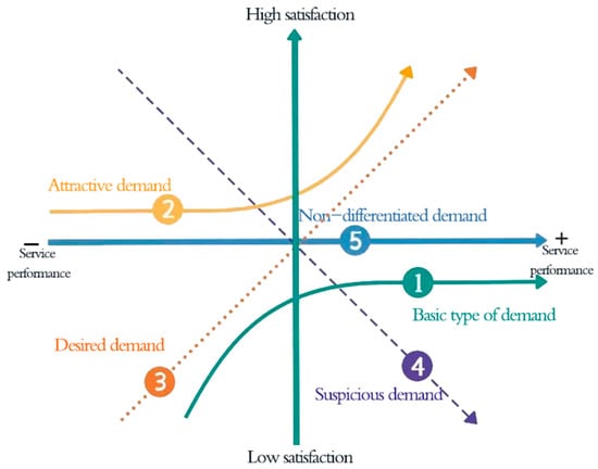 The KANO model was developed by Noriaki Kano, a professor at the Tokyo Institute of Technology and a world-renowned quality management guru, and is primarily used to demonstrate the relationship between a product or service and customer satisfaction. It is a theory and tool for classifying and prioritizing user needs [20]. The KANO model can, therefore, assist designers in providing an effective method for designing products and services that satisfy customers. The KANO model is currently used in many fields and is commonly used in user needs research and product design. It is also widely used in the Internet, service design and product and quality management research centers. Due to the extensive use of the KANO model in requirements research, it is also applicable to the study of consumer needs in community business.