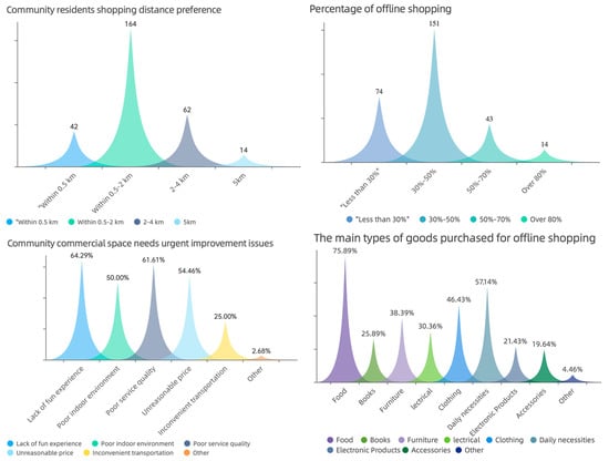 Based on interviews with community residents and consumers, residents’ views on various elements of the business situation in the community were understood. Judging from the results of the questionnaire (Figure 3), more residents prefer to choose commercial space 0.5–2 km away from the community, and have more needs for offline shopping; most residents prefer good service quality and interesting and comfortable space environment in their commercial space consumption experience; in addition to the purchase of basic necessities, residents also need to consume clothing, home and other categories offline. At the same time, book bars and cafés are also the types of businesses concerned by community residents.