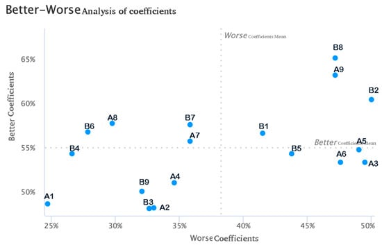 After compiling the questionnaire data, the 18 user demand indicators were classified and numbered according to the KANO attributes, and the Better–Worse coefficients were calculated, as shown in Table 3. The calculation formula is:
