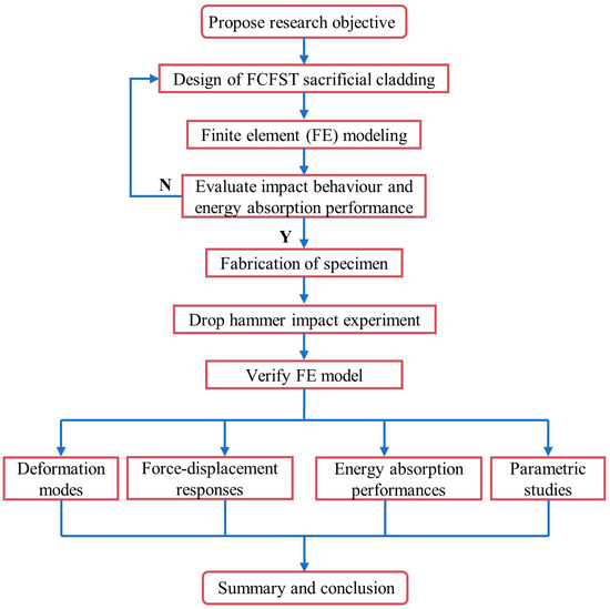 In this paper, a novel sandwich-type sacrificial cladding with foam concrete-filled square tubes (FCFST sacrificial cladding) was developed for building and infrastructure protection to dissipate impact energy, as shown in Figure 1. The impact behaviour of the FCFST sacrificial cladding is experimentally and numerically investigated. The flowchart of this study process is illustrated in Figure 2, and the remaining sections are organized as follows: Section 2 presents the experimental and numerical methodologies employed in this study. It includes the design of specimens, setup of the drop hammer impact experiment, the finite element (FE) model, and material models. In Section 3, the acceptability of the FE model is first verified by comparing the experimental and numerical results. The deformation mode, force–displacement response and energy absorption performance of the FCFST sacrificial claddings are discussed subsequently. Furthermore, parameter studies were conducted in FE simulations to investigate the effects of the thickness ratio of the top plate to tube, width-to-thickness ratio of the tube and impact location on the impact behaviour of the FCFST sacrificial cladding. Section 4 summarizes the key findings and conclusions derived from this study. This study is of significance for understanding the impact behaviour of the FCFST sacrificial cladding and facilitating its application as a new sacrificial cladding.