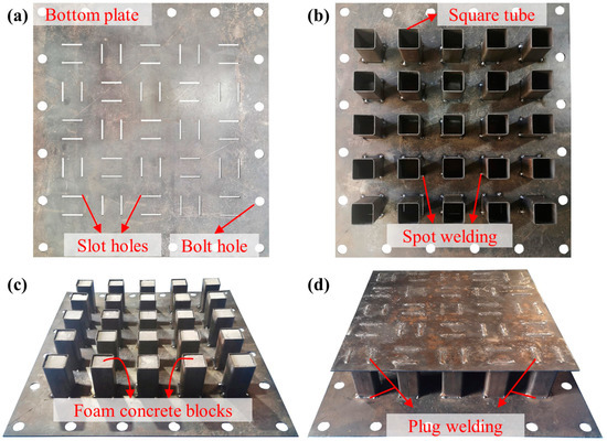 Figure 3. Fabrication process of the FCFST sacrificial cladding. (a) Slitting slot holes and drilling bolt holes; (b) fixing of square tubes; (c) filling of foam concrete cuboids; and (d) plug welding between flat plates and square tubes.