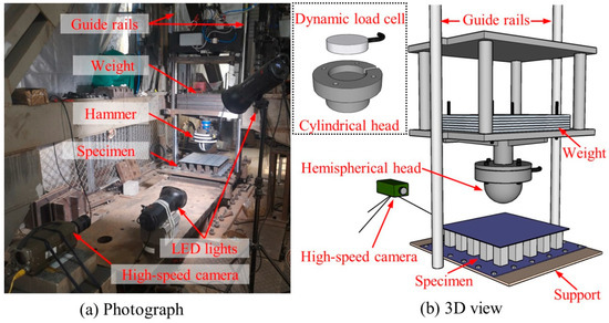 A drop hammer impact experiment system was employed to conduct the experiment on the FCFST sacrificial cladding; its photograph and 3D view are shown in Figure 4. The drop hammer impact experiment system comprises a hydraulic-controlled mechanical hosting system, a counterweight device, a hammer with a replaceable hammer head, a dynamic load cell embedded into the hammer, two guide rails, a high-speed camera and two LED lights. The hammer drops freely along the two guide rails and hits the specimen when the electromagnet release mechanism is triggered. The FCFST sacrificial cladding was fixed on a rigid support via 20 high-strength bolts with a grade of 8.8. As illustrated in Figure 4, the impact location in the experiment was located at the centre of the specimen. In addition, a hemispherical head and a cylindrical head with the same diameter of 200 mm were employed for the specimen H-SC and C-SC, respectively, as illustrated in Figure 4 (the relationships between the name of the specimen and impactor shape are shown in Table 1). The two experiments share the same drop weight of 790 kg and the same drop height of 3.85 m, and the measured hammer velocities and corresponding impact energies are listed in Table 1. The impact force was measured through employing the dynamic load cell with a measurement capacity of 2000 kN. The high-speed camera with a speed of 3000 frames per second was employed to obtain the impact process and the displacement histories of the drop hammer.