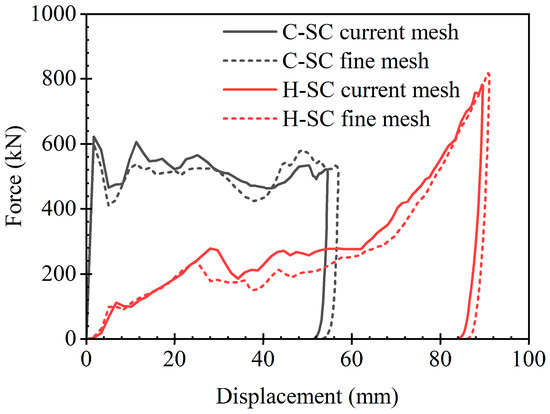 Apart from the experimental study, FE simulation analysis was carried out by the explicit nonlinear program LS-DYNA. The established FE model of the FCFST sacrificial cladding is presented in Figure 5, and its geometric parameters are the same as those of the specimens. The foam concrete blocks and hammer were meshed using an eight-node solid element, while the two flat plates, square tubes and support were meshed with the four-node Belytschko-Tsay shell element. Owing to the significant deformation observed during the experiment, a mesh size of 5 mm was adopted in the top plate, square tubes and foam concrete blocks. The mesh sensitivity analysis was performed by halving the size of all elements, and the impact force–displacement curves obtained from the FE simulation using current mesh and fine mesh are compared in Figure 6. Similar results can be observed for both the C-SC and H-SC, while the computation time for the fine mesh (around 9 h) is about three times than that of the current mesh. Given the balance between computational cost and accuracy, the current mesh size was employed in the FE analysis below, and a total of 103,443 elements and 127,417 nodes were used in the FE model shown in Figure 5.