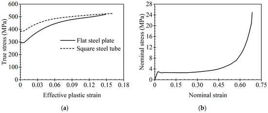 Q235 steel was selected to fabricate the metal parts of the specimens, and the steel properties of the square tubes and flat plates obtained from quasi-static tensile tests are illustrated in Table 2. In addition, the true stress–effective plastic strain curves of the square tubes and flat plates are presented in Figure 7a. The material model MAT_PIECEWISE_LINEAR_PLASTICITY was selected to model the mechanical behaviour of the steel materials. In addition to the steel properties mentioned above, a failure strain of 0.15 was also defined to simulate fracture of the flat plates. The Cowper–Symonds model was employed in this material model to account for the strain–rate effect, and it can be formulated as: