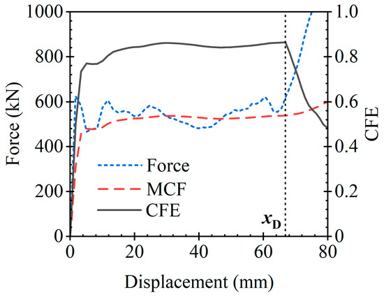 where the E A ( δ ) is the energy absorption corresponding to the displacement δ . As illustrated in Figure 8, the sacrificial cladding reaches the densification displacement (xD) when the CFE drops continuously and suddenly [54].