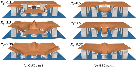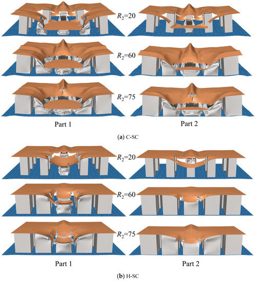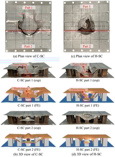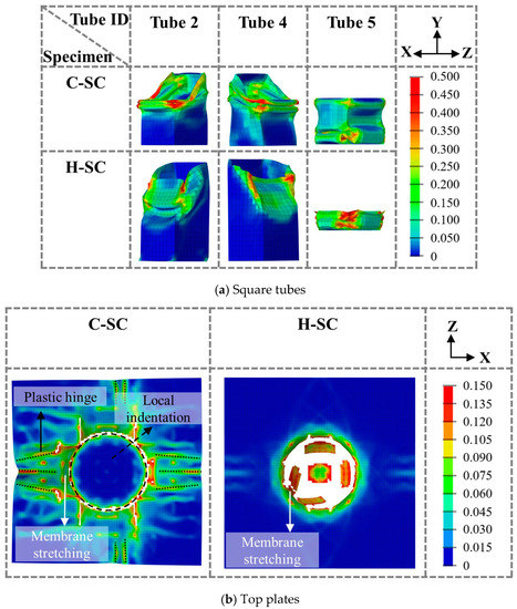 Figure 12b presents the effective plastic strain contours of the top plates of the C-SC and H-SC. It is evident that the plastic deformation zone that appeared at the top plate of the C-SC is larger than that of the H-SC. For the C-SC, a circular local indentation zone is formed under the impact load, and its shape and size are determined by that of the cylindrical head. The fracture of the top plate can be observed at the indentation zone along the edge of the cylindrical head, which may be caused by significant membrane stretching around the indentation zone and evident rotation of the plastic hinge at the edge of the indentation zone. In addition, some plastic hinge lines are formed at the edge zone of the top plate, which can enhance the energy absorption capacity. For the H-SC, the plastic deformation and fracture are concentrated in the impact zone of the top plate. High effective plastic strain values can be observed from elements within the impact zone, as shown in Figure 12b, which indicates that evident membrane stretching occurred in this zone and dissipated the impact energy effectively.