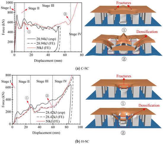 The force–displacement curves of the C-SC and H-SC obtained from the experiment and FE simulation are shown in Figure 10. Apart from the impact energy used in the experiment, a higher impact energy (50 kJ) was adopted in the FE model to obtain the whole force–displacement responses of the specimens (i.e., the densifications of the specimens are reached) under the impact of the cylindrical and hemispherical hammer heads. The impact responses in both these two specimens can be classified into four stages based on the characteristics of their force–displacement curves. In the initial stage, the impact force of the C-SC increases rapidly with its displacement, as shown in Figure 10a. This is because the tubes under the cylindrical head (i.e., tubes 2, 4, 5, 6 and 8) are subjected to the impact of the hammer, while tubes under impact loads have a good axial bearing capacity before buckling. Entering stage II, a sharp decline can be observed in the impact force as buckling occurs on the tubes. When the displacement reaches 11.72 mm, fractures appear at the impact zone of the top plate, and the resistance of the top plate decreases. This leads to a decrease in the impact force, and then the force–displacement response enters stage III. Furthermore, the curve exhibits some fluctuations during stage III owing to the successive fracture of the top plate and progressive collapse of the tubes. Finally, the impact force increases rapidly and continuously, indicating that densification of the C-SC has been reached. In the case of the H-SC, the contact area between the specimen and hammer increases with further downward movement of the hammer, which is quite different from the C-SC. This results in a slow growth in the impact force at the initial stage. Subsequently, a continuous increase in the impact force is observed owing to the membrane stretching of the top plate, after the decrease caused by the buckling of the tubes. Entering stage III, the impact force presents a continuous decrease until displacement reaches 33.53 mm, when the top plate zone on tube 5 separates from the other part and membrane stretching failure occurs. With further impacting, the contact area between the hammer and the H-SC increases and more tubes are subjected to the impact loading. This leads to a slight rise in the impact force after the separation of the top plate zone on tube 5. Finally, a sharp increase in the impact force can be observed when the displacement exceeds 66.86 mm, and the densification and ultimate energy dissipation capacity of the H-SC are reached.