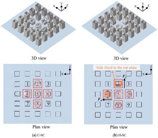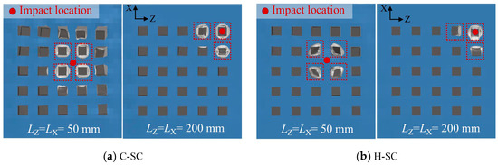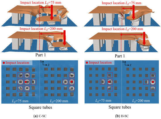 Figure 22. Deformation modes of the square tubes of the FCFST sacrificial cladding under impact locations of LZ = LX = 50 mm and LZ = LX = 200 mm.