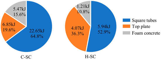 Figure 13 illustrates the energy absorption in the various parts (i.e., the top plates, tubes and foam concrete blocks) of the C-SC and H-SC, which correspond to their densification displacements, respectively. The results indicate that the tubes are the main energy-absorbing part, accounting for more than half of the total EA. Given the excellent energy absorption performance of the tubes, the EA of each tube is obtained by FE simulations. The result shows that the majority of the energy dissipation of the tubes is the contribution of tubes 2, 4, 5, 6 and 8 (the numbering of the tubes is shown in Figure 14a), as these five tubes experience obvious plastic deformation. Figure 14b shows the EAs of tubes 2, 4, 5, 6 and 8 of the C-SC and H-SC. The EAs of these five tubes are similar for the C-SC, indicating that the irregular plastic collapse in tubes 2, 4, 6 and 8 can also effectively absorb the impact energy. Nevertheless, tube 5 exhibits an evidently higher EA than the other four tubes (i.e., tubes 2, 4, 6 and 8) for the H-SC. This suggests that the plastic folding in tube 5 is more effective than the inward plastic deformation of the other four tubes in energy dissipation. The top plate can also absorb the impact energy through the plastic hinges and membrane stretching, as well as fractures and the top plate of the C-SC, which has a higher EA than that of the H-SC owing to the larger plastic deformation zone. In addition, more than 10% of the impact energy is dissipated by the foam concrete.