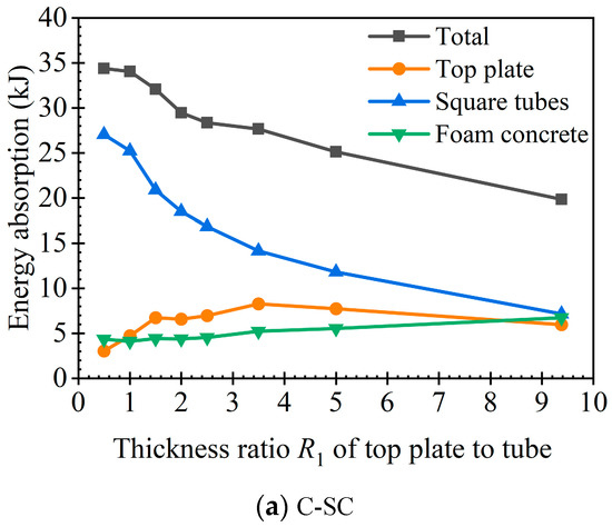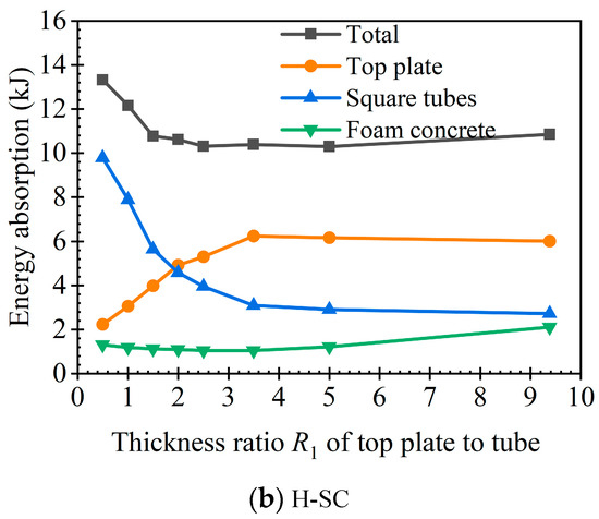 The EAs and deformation modes of the claddings with various R1 values are shown in Figure 15 and Figure 16, respectively. The EA of the specimen C-SC generally exhibits a decreasing trend with the increase in the thickness ratio R1. Specifically, as the R1 increases from 0.5 to 1.5 and 9.38, the EA decreases by 6.46% and 42.34%, respectively. This decreasing trend is mainly caused by the decline in the EA of the tubes, which dissipates the majority of the impact energy. The reduction in the thickness of the tubes directly leads to a decrease in MCF as R1 increases [55], resulting in less energy dissipation of the tubes for the same densification displacement. Moreover, the EA of the top plate for the C-SC exhibits an increasing trend followed by a decrease as the R1 increases, and the highest value is reached when R1 is 3.5. This could be attributed to the change in its plastic deformation mode, as shown in Figure 16a. The premature fracture of the thinner top plate limits the development of its plastic deformation, which results in a 63.53% decline in the EA of the top plate as the R1 decreases from 3.5 to 0.5. However, the EA of the top plate decreases by 28.14% on increasing the R1 from 3.5 to 9.38. This is caused by the reduction in the plastic deformation of the top plate in the C-SC. As the R1 increases, the foam concrete blocks experience more compressive deformation, resulting in a continuous increase in their EA. With regard to the specimen H-SC, the EA shows a stable tendency after an initial decrease with the increase in R1. The tubes and top plate in the H-SC exhibit similar trends with those of the C-SC, but their EAs decrease slightly as the R1 increases from 3.5 to 9.38. In addition, the major impact energy is dissipated by the top plate when the R1 exceeds 2, which is different from the C-SC. It is noted that fracture of the top plate can be observed in the H-SC but not in the C-SC when R1 reaches 9.38. This indicates that the fracture may occur more easily for the smaller contact area between the cladding and impactor, with the same drop weight and velocity. In general, decreasing the thickness ratio R1 can enhance the energy absorption performance of the FCFST sacrificial cladding.