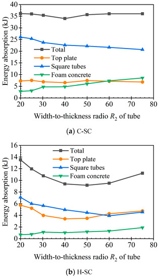 The EAs in the sacrificial claddings with various width-to-thickness ratio R2 values are compared in Figure 17. The classical deformation modes in the specimens C-SC and H-SC with an R2 of 20, 60 and 75 are illustrated in Figure 18. The EA in the C-SC is not apparently affected by the variation in the R2. As shown in Figure 17a, the maximum value of the EA is reached when the R2 is 20, and it is only 6.21% larger than the minimum value when the R2 is 40. On the one hand, the thickness of the tube has a more significant effect than its width on the MCF when it deforms with the manner of plastic folding [55]. This leads to a reduction in the MCF of the tubes as R2 increases; thus, its EA exhibits a decreasing trend. On the other hand, more foam concrete is crushed, resulting in a steady rise in its EA with the increase in the R2. Moreover, the foam concrete dissipates more impact energy than the top plate when the R2 exceeds 60. As for the specimen H-SC, increasing the R2 is found to result in the trend of an initial decrease and then an increase in the EA, and the same trend can be observed in the EAs of its top plate and tubes. Figure 18b shows that the plastic deformation of the tubes at the impact zone increases as R2 increases from 60 to 75, which may be evidence for the slight rise in the EA of the tubes. In addition, the EA of the foam concrete gradually rises with the increase in the R2, and it keeps the same tendency with that of the C-SC. The above results indicate that increasing the R2 will lead to an increase in the EA in foam concrete.