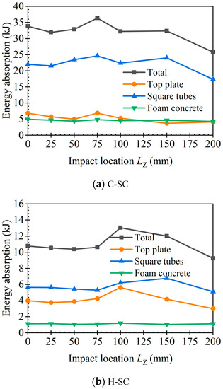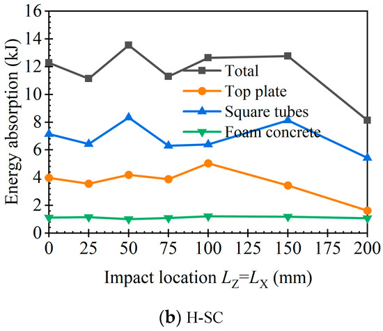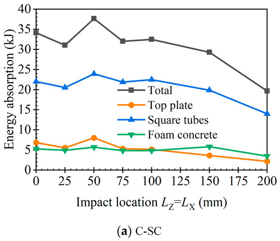 Figure 19 illustrates the EAs in claddings under various impact locations along the Z-axis direction (LZ). The typical deformation modes of the C-SC and H-SC under various impact locations (LZ = 75 and 200 mm) are compared in Figure 20. As the LZ increases, the EA in C-SC does not show a marked decline until LZ reaches 200 mm. In detail, the energy absorption performance in the C-SC is significantly affected by the EA of its tubes, and almost the same tendency can be found in the EAs between the specimen and the tubes. When LZ is 200 mm, the number of square tubes experiencing evident plastic deformation is reduced compared to other impact locations, as shown in Figure 20a. This results in a greater than 25% decline in the EA compared to the impact location LZ = 150 mm. The EA in the H-SC exhibits the same result as that of the C-SC, i.e., a significant decrease is observed until LZ is 200 mm. However, the energy absorption proportion of the top plate for the H-SC is higher than that for the C-SC, which indicates that the energy absorption performance of the top plate significantly affects the EA of the H-SC. For instance, the decrease in the energy dissipation of the top plate directly results in a reduction in the EA of H-SC as LZ increases from 100 to 150 mm, though the EA of the tubes slightly increases. Furthermore, the EAs and deformation modes of the tubes of claddings under various impact locations along the diagonal direction between the X-axis and Z-axis are compared in Figure 21 and Figure 22, respectively. It is evident that the EAs have the same results as those under various impact locations along the Z-axis, i.e., the EA decreases significantly when the impact location is far from the centre of the specimen. In addition, significant plastic deformation can be found among all four tubes within the impact zone when LZ and LX are 50 mm, as shown in Figure 22. This leads to the highest EAs of the specimen and tubes. In general, the FCFST sacrificial cladding can dissipate impact energy effectively unless the impact location is close to its edge.