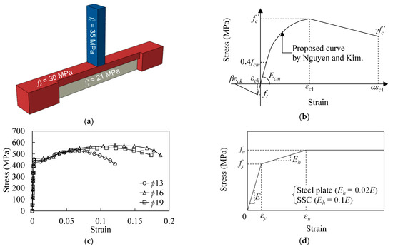 where f t is the tensile strength, and ε c k is the tensile strain at f t . The f t value was assumed to be 10% of f c , and β was set to 50 for the purposes of analytical stabilization. The material properties of the reinforcing bars obtained from the test results are as shown in Figure 6c. Figure 6d shows the trilinear stress–strain relationship used for the constitutive models of the steel, as per Xu et al. [20]. Depending on the type of steel, the mechanical properties considered in this study are summarized in Table 3.