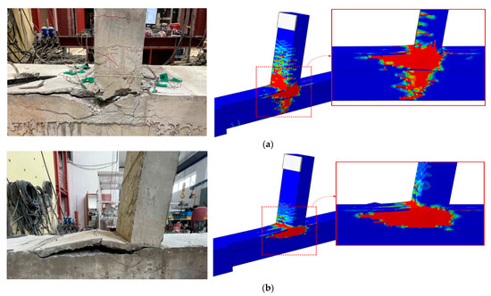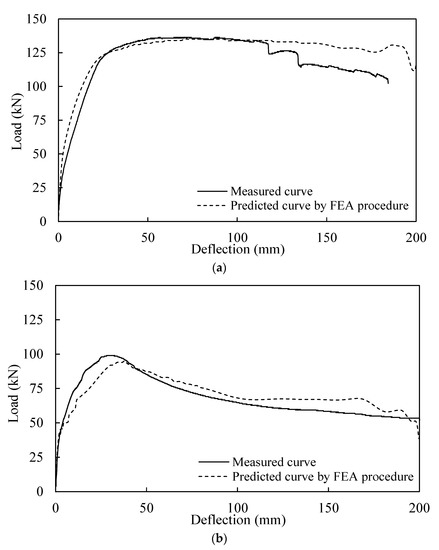 Figure 7 shows the failure modes of the SCBW specimens obtained from the flexural tests and FEA. In the SCBW specimens with the longitudinal reinforcing bars of the slab anchored in the CIP (Specimen C), the initial flexural cracks occurred in the maximum-moment region near the composite basement wall junction. Flexural cracks appeared in the slabs as the load increased. After the yielding of the longitudinal reinforcing bars in the slab, some cracks propagated in both the CIP and the basement wall sections. After reaching the peak load, the cracks in the composite basement wall junction intensified. Finally, the concrete crushing failure occurred in the compression zone, resulting in the termination of the flexural test. As shown in Figure 7a, anchoring the longitudinal reinforcing bars by penetrating the steel plate into the CIP was effective in distributing the cracks along the length of the slab or at the junction with the basement wall. These trends were completely different from those observed in the SCBW specimens with the longitudinal reinforcing bars of the slab anchored on the basement wall (Specimen B). In Specimen B, the initial flexural cracks occurred in the maximum-moment region near the composite basement wall junction. As the load increased, some cracks propagated only in the basement wall section, and no cracks occurred in the slab. Subsequently, the cracks that occurred in the basement wall section intensified, and, after the peak load was applied, concrete spalling of the splitting cracks occurred in the basement wall section, resulting in the termination of the flexural test. This is because the shear strength of the concrete cover where the longitudinal reinforcing bars were anchored was not sufficient to resist the shear force introduced by the tension force of the slab in flexure, resulting in splitting failure before the longitudinal reinforcing bars were yielded. As shown in Figure 7b, it can be concluded that anchoring the longitudinal reinforcing bars into the basement wall was unfavorable for distributing cracks along the slab’s length. In particular, splitting cracks near the anchorage location of the longitudinal reinforcing bars must be controlled to minimize the development of intensified cracks in the composite basement wall junction.