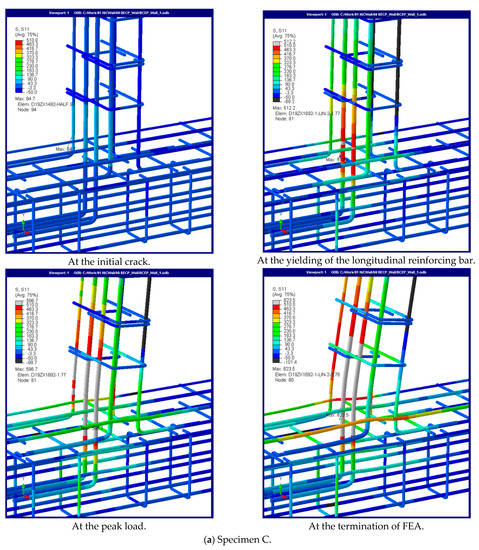 Figure 10 and Table 6 show the maximum stress and strain of the longitudinal reinforcing bars in the slab according to each stage described in the section on the load–deflection relationship. Note that this section was analyzed based only on the FEA results. In the SCBW specimens with the longitudinal reinforcing bars of the slab anchored in the CIP (Specimen C), at the point of the initial crack, the maximum stress and strain of the longitudinal reinforcing bars in the slab occurred near the composite basement wall junction, with values of 84.7 MPa and 0.00042, respectively, which were 83% lower than those obtained from the yielding of the longitudinal reinforcing bars. The yielding location of the longitudinal reinforcing bar was near the composite basement wall junction. At the peak load, the maximum stress and strain values of the longitudinal reinforcing bars in the slab occurred in the potential plastic hinge near the composite basement wall junction and were 596.7 MPa and 0.042, respectively: 1.17 and 21 times higher, respectively, than those obtained from the yielding of the longitudinal reinforcing bars. After the peak load, the longitudinal reinforcing bars of the slab experienced a stress exceeding 400 MPa in the region between the composite basement wall and 0.2 L along the slab. Notably, this region was similar to the predicted value (271 mm) of the equivalent plastic hinge length ( L p = 0.08 a s + 0.022 d b f y ) proposed by Priestley and Park [21]. This implies that anchoring the longitudinal reinforcing bars by penetrating the steel plate into the CIP is sufficient to develop the yield stress of the longitudinal reinforcing bars in the slab, resulting in ductile behavior. However, as with the analysis of the load–deflection relationship, these trends were completely different from those observed in the SCBW specimens with the longitudinal reinforcing bars of the slab anchored to the basement wall (Specimen B). In Specimen B, at the point of the initial crack, the maximum stress and strain values of the longitudinal reinforcing bars in the slab occurred near the composite basement wall junction and were 84.6 MPa and 0.0041, respectively, which were similar to the values observed in Specimen C. At the peak load, the maximum stress of the longitudinal reinforcing bars in the slab occurred near the composite basement wall junction, with a value of 462 MPa. This value was approximately 10% lower than that obtained from the yielding of the longitudinal reinforcing bars, indicating that the stress of the longitudinal reinforcing bars in the slab did not contribute significantly to the ductile flexural behavior. Instead, the longitudinal reinforcing bars of the basement wall near the composite basement wall junction were obtained. After the peak load, the stress and strain values of the longitudinal reinforcing bars in the slab remained within a range similar to that obtained at the peak load, and the number of yielded longitudinal reinforcing bars in the basement wall increased. Consequently, transverse reinforcement must be provided for the longitudinal reinforcing bars of the basement wall near the composite basement wall junction to prevent buckling and concrete spalling caused by splitting cracks.
