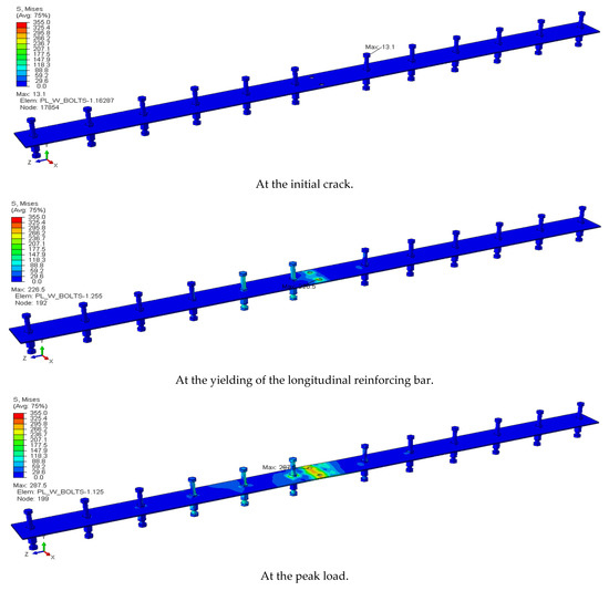 Figure 11 and Table 6 present the von Mises stress of the steel plate and SSC based on the FEA results according to each stage described in the section on the load–deflection relationship. In the SCBW specimens with the longitudinal reinforcing bars of the slab anchored in the CIP (Specimen C), the maximum stress in the steel plate and SSC occurred near the location penetrated by the longitudinal reinforcing bars of the slab. The stresses in the steel plate and SSC increased gradually and were 226.5 MPa and 153.2 MPa, respectively, at the point of yielding of the longitudinal reinforcing bar. Specifically, the stress in the steel plate reached the yield point after the peak load, whereas the SSC remained in an elastic state until the FEA was terminated. This implies that the steel plate located near the area penetrated by the longitudinal reinforcing bars of the slab played a crucial role in anchoring the longitudinal reinforcing bars of the slab. However, these trends were completely different from those observed in the SCBW specimens with the longitudinal reinforcing bars of the slab anchored on the basement wall (Specimen B). In Specimen B, at the initial crack, the maximum stresses in the steel plate and SSC occurred near the anchorage location of the longitudinal reinforcing bars of the slab in the basement wall section. After the initial crack, only the stress in the SSC installed in the basement wall section increased gradually. At the peak load, it reached 236.8 MPa, which is similar to the yielding strength of the SSC. However, the stress in the SSC and the steel plate installed in the CIP section remained in an elastic state until the FEA was terminated. This implies that the tensile stress in the longitudinal reinforcing bars of the slab was not transferred to the CIP at the composite basement wall junction.