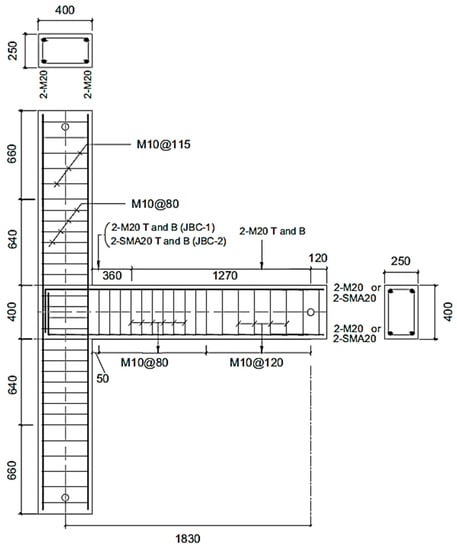 Reinforcement details of specimens, steel-BCJ and SMA-BCJ (all dimensions in mm). Reprinted from [