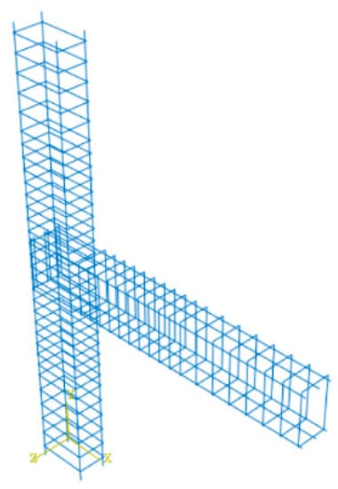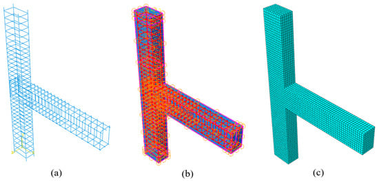 (a) Reinforcement of RC beam column joint. (b) Embedded region contact between concrete and reinforcement. (c) Typical finite element mesh of RC-BCJ.