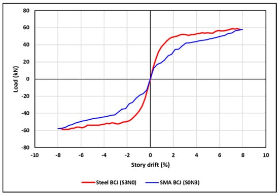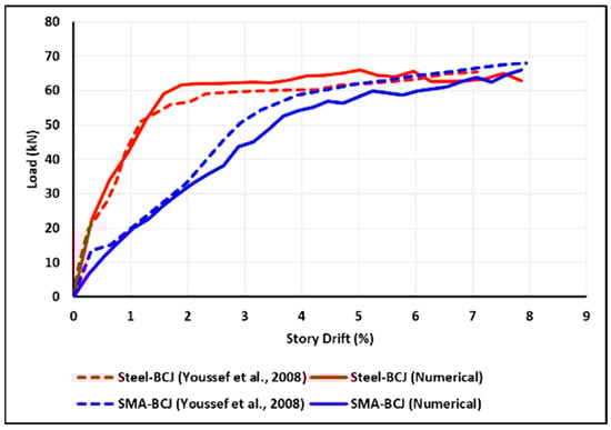 Experimental and numerical beam tip-load versus story drift envelope for the specimens steel-BCJ and SMA-BCJ [